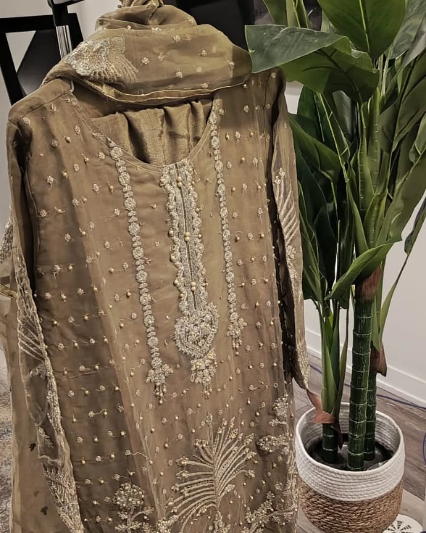 Elegance meets timeless craftsmanship in this antique gold suit adorned with detailed threadwork and embellishments. The rich embroidery and delicate pearl accents create an opulent look, making it ideal for formal events and evening gatherings. Pair it with traditional jewelry for an unforgettable statement. 💫