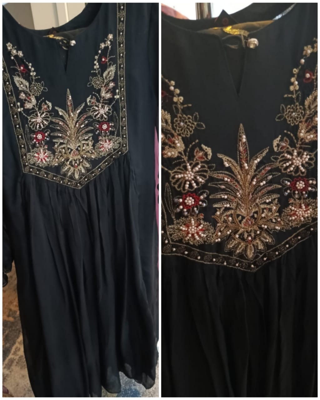 This charming Black frock and dupatta set is the epitome of grace and simplicity. Made from soft, breathable fabric, the frock features delicate embroidery in subtle tones, adding a touch of elegance to its classic design. The matching dupatta, adorned with intricate lace detailing, enhances the ensemble, making it ideal for casual gatherings, festive celebrations, or family occasions.