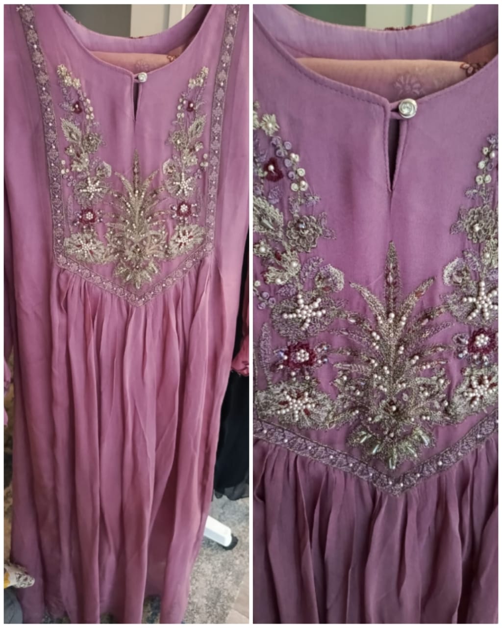 This charming pink frock and dupatta set is the epitome of grace and simplicity. Made from soft, breathable fabric, the frock features delicate embroidery in subtle tones, adding a touch of elegance to its classic design. The matching dupatta, adorned with intricate lace detailing, enhances the ensemble, making it ideal for casual gatherings, festive celebrations, or family occasions.